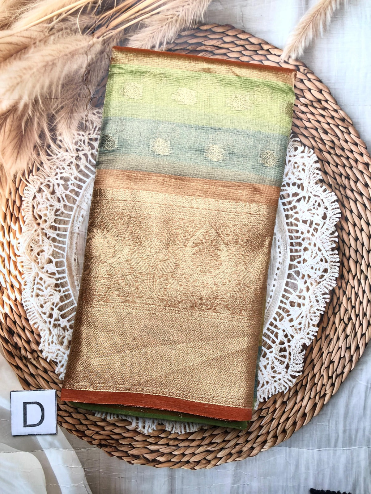 Elegant Multi Colour Tissue Saree with zari floral buttas and floral design border perfect for pooja ceremony and temples and festivals. Shipping charges applicable additionally based on delivery address and country.