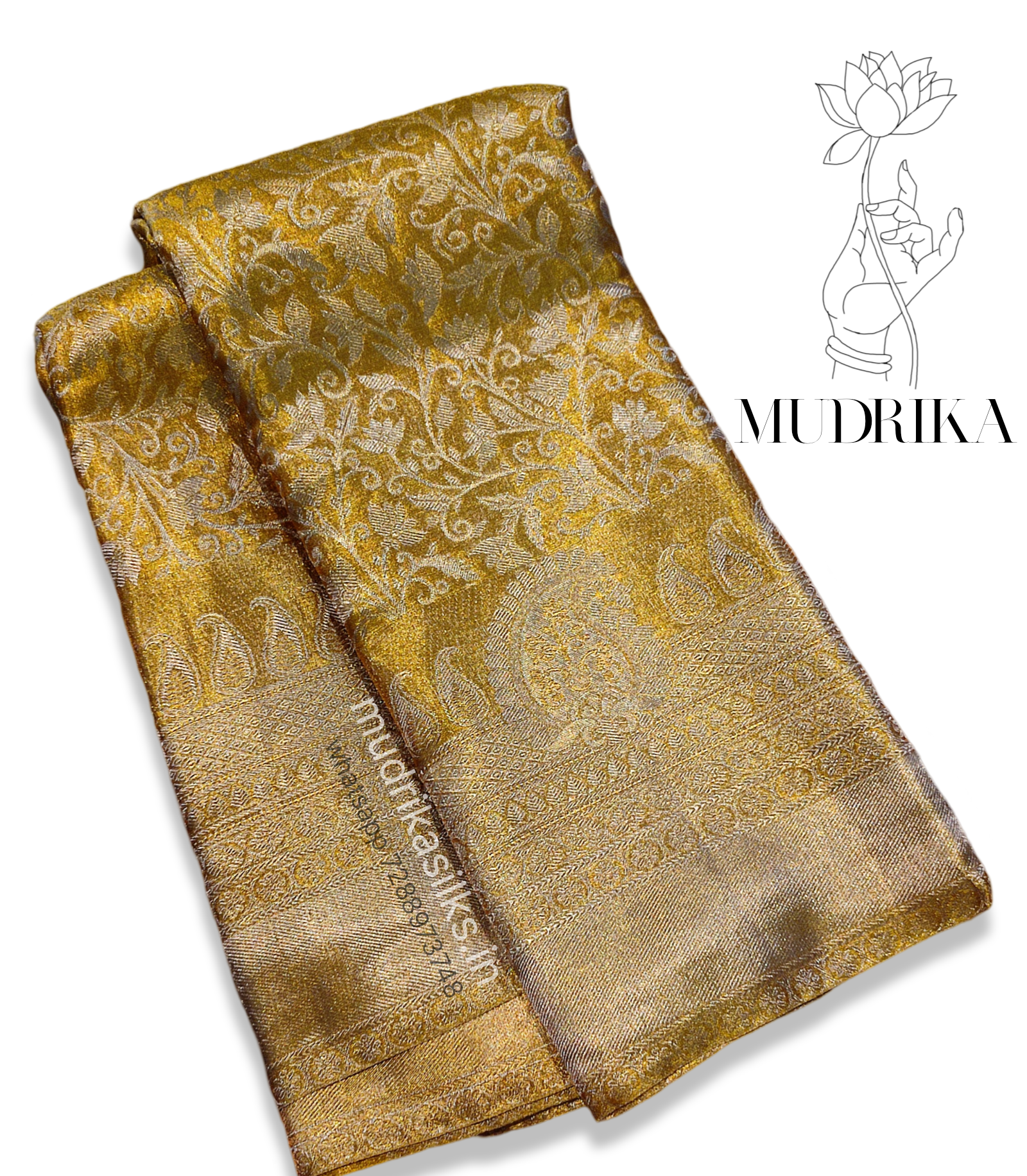 This exquisite golden yellow tissue Kanjivaram bridal saree is a true symbol of luxury and tradition. Woven from premium tissue silk, the saree boasts a luminous golden sheen that enhances its grand appeal. The intricate silver zari work weaves delicate patterns across the body and border, creating a stunning contrast and adding a contemporary touch to this traditional masterpiece. Perfect for brides seeking a blend of elegance and opulence, this saree is ideal for weddings and special occasions. Pair it with statement jewelry and a traditional hairstyle for a timeless bridal look.
