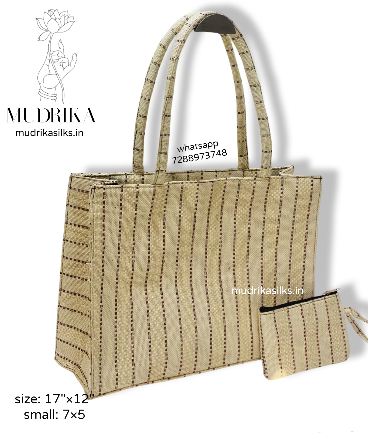 Stylish, sturdy, and sustainable—our jute strips tote bag is your perfect everyday companion. Crafted from jute . it offers a spacious main compartment to carry everything from groceries to books and daily essentials. With reinforced handles for comfortable shoulder wear and a minimalist design that suits any outfit, this tote combines function with fashion. Ideal for shopping, commuting, or weekend outings, it’s a reusable alternative that supports your eco-conscious lifestyle.