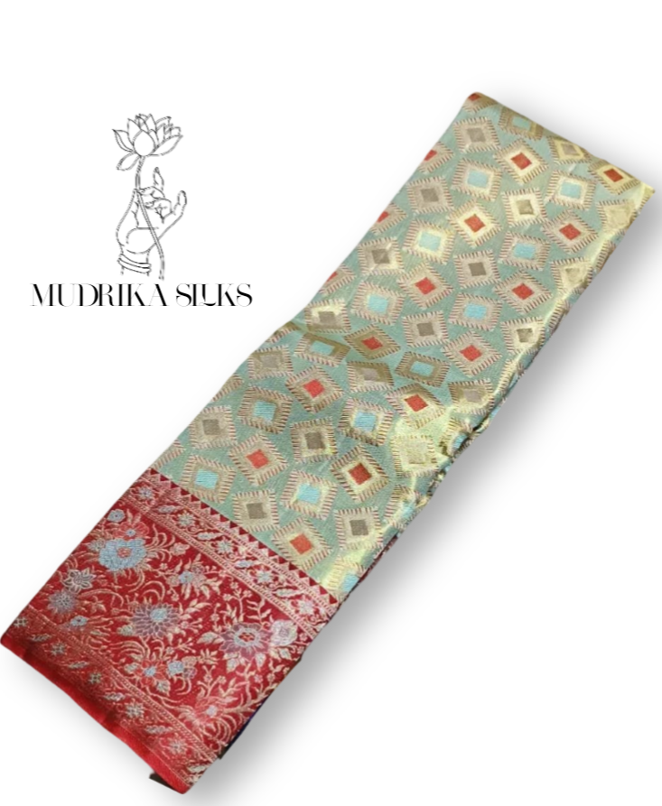 Elegant kanchipattu tissue designer saree with intricately weaved geometric design with floral zari weaved design border perfect for weddings and receptions . Whatsapp 7288973748 for any queries. Colours may slightly vary due photography lighting.